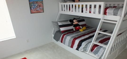 The huge master suite features a US king-sized bed, large Flat Screen HD LCD TV with Digital streaming (with remote control of course) and a radio/alarm so you don't miss that early start for the theme parks The luxurious en suite has an indulgent roman tub bath - bring your favourite bubbles, large walk-in shower, His & Hers wash basins with complimentary hairdryer and plenty of storage space. Lots of fluffy towels are also supplied.